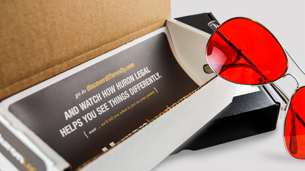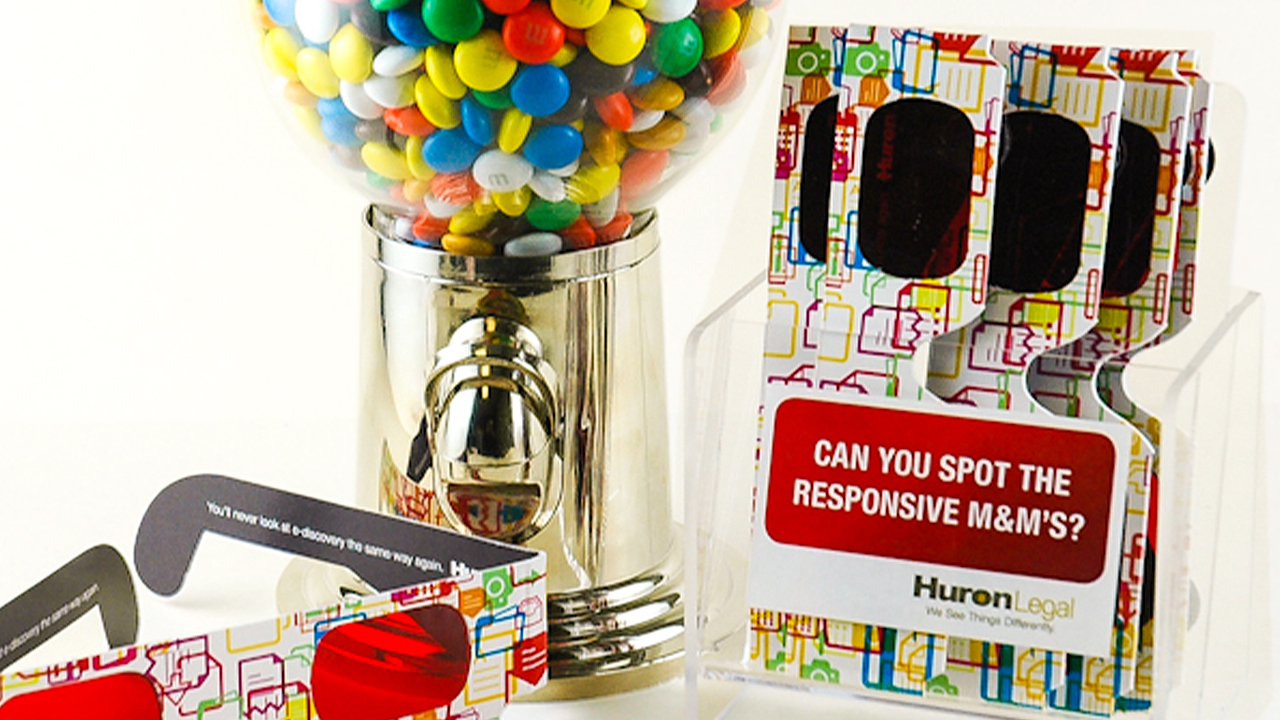 Huron Legal developed a revolutionary e-discovery solution that eliminates up to 70% of irrelevant data right from the start. We spread the word to C-level legal executives by ratcheting up the “wow” factor. First, we established a theme about “seeing things differently.” Next, we sent them red reveal glasses that magically made irrelevant data disappear when they watched our video. In two weeks, Huron scheduled 45 meetings. The theme also supported a follow-up mailer coffee-table book, t-shirt messaging and strategically-colored M&M’s that were used in employee lounges and sales presentations. For a trade show, we offered the ultimate chance to “see things differently”—a trip aboard Virgin Galactic. The promotion resulted in more than a 60% increase in booth traffic over the previous year.